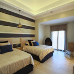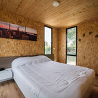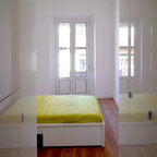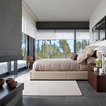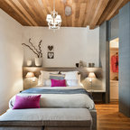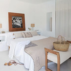 Inspiration för mellanstora moderna huvudsovrum, med vita väggar och skiffergolv — Houzz