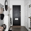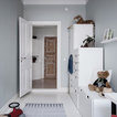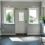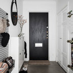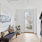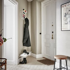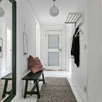 Inredning av en skandinavisk mellanstor entré, med vita väggar, ljust trägolv och beiget golv — Houzz