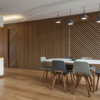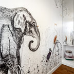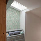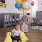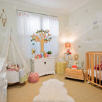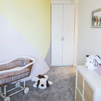 Inspiration för mellanstora moderna könsneutrala babyrum, med vita väggar och mellanmörkt trägolv — Houzz