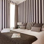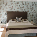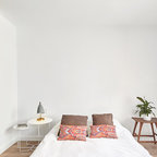 Foto på ett mellanstort funkis huvudsovrum, med vita väggar och klinkergolv i keramik — Houzz