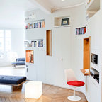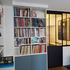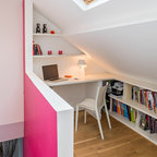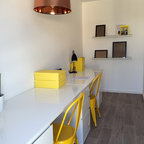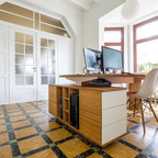 Modern inredning av ett hemmabibliotek, med vita väggar, ett fristående skrivbord och grått golv — Houzz