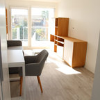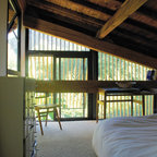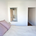 Modern inredning av ett sovrum, med grå väggar och mellanmörkt trägolv — Houzz