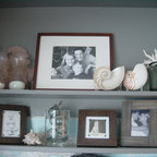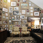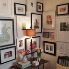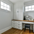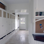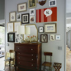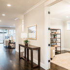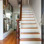 Bild på en vintage hall, med vita väggar och mellanmörkt trägolv — Houzz