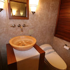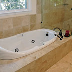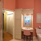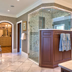 We utilized a Moroccan inspired mirror to accentuate and play with the unusual slanted roof line. By adding clean lines and ample drawers for storage, we were able to transform this outdated bathroom into a true modern master retreat.