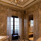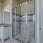 Inredning av ett klassiskt mellanstort vit vitt en-suite badrum, med luckor med infälld panel, vita skåp, en kantlös dusch, en toalettstol med separat cisternkåpa, vit kakel, tunnelbanekakel, vita väggar, marmorgolv, ett undermonterad handfat, marmorbänkskiva, vitt golv och dusch med gångjärnsdörr — Houzz