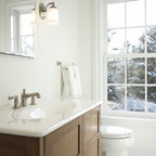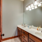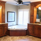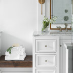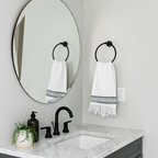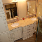 We utilized a Moroccan inspired mirror to accentuate and play with the unusual slanted roof line. By adding clean lines and ample drawers for storage, we were able to transform this outdated bathroom into a true modern master retreat.