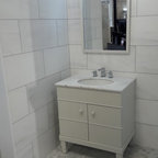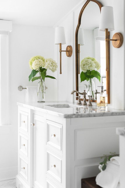 Idéer för ett mellanstort klassiskt vit en-suite badrum, med luckor med infälld panel, vita skåp, en kantlös dusch, en toalettstol med separat cisternkåpa, vit kakel, tunnelbanekakel, vita väggar, marmorgolv, ett undermonterad handfat, marmorbänkskiva, vitt golv och dusch med gångjärnsdörr — Houzz