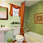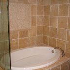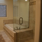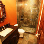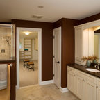 We utilized a Moroccan inspired mirror to accentuate and play with the unusual slanted roof line. By adding clean lines and ample drawers for storage, we were able to transform this outdated bathroom into a true modern master retreat.