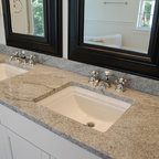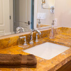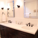We utilized a Moroccan inspired mirror to accentuate and play with the unusual slanted roof line. By adding clean lines and ample drawers for storage, we were able to transform this outdated bathroom into a true modern master retreat.