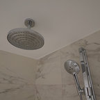 Inspiration för små moderna badrum med dusch, med blå skåp, en öppen dusch, vit kakel, grå väggar, marmorgolv och grått golv — Houzz