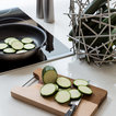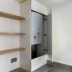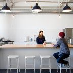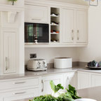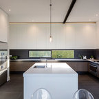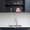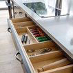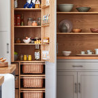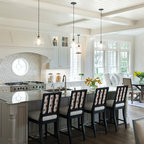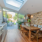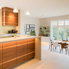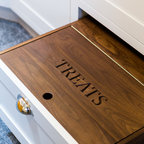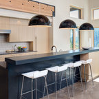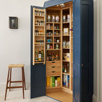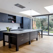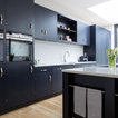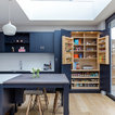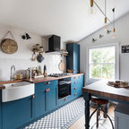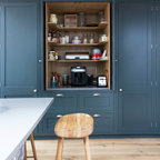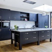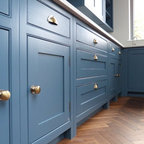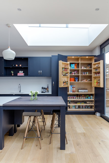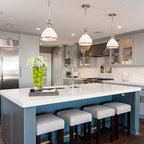 Inredning av ett klassiskt stort blå blått kök, med en enkel diskho, bänkskiva i glas, mellanmörkt trägolv, brunt golv, blå skåp, vitt stänkskydd, en köksö och släta luckor — Houzz
