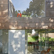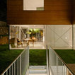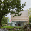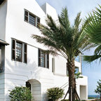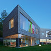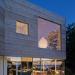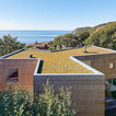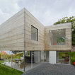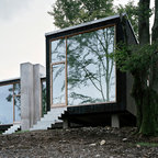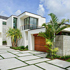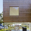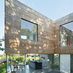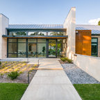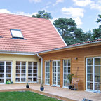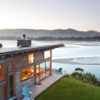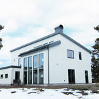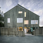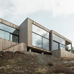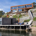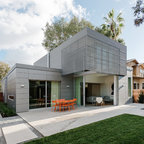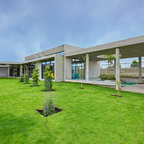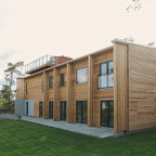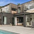 Idéer för mycket stora funkis beige trähus, med allt i ett plan och platt tak — Houzz