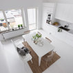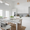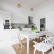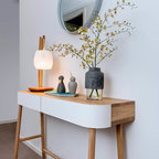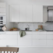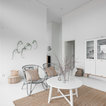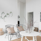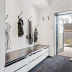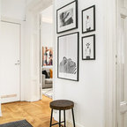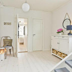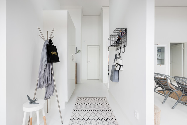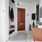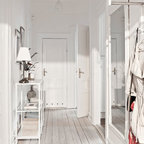 Idéer för nordiska hallar, med vita väggar, en enkeldörr, målat trägolv, en vit dörr och vitt golv — Houzz
