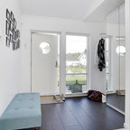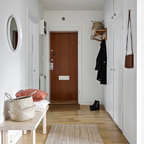 Foto på en mellanstor nordisk foajé, med vita väggar, flerfärgat golv, en enkeldörr och en vit dörr — Houzz