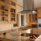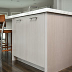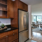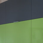 Exempel på ett litet modernt kök, med en enkel diskho, släta luckor, skåp i mörkt trä, grönt stänkskydd, rostfria vitvaror och mellanmörkt trägolv — Houzz