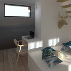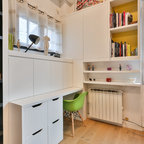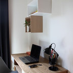 Exempel på ett litet skandinaviskt hemmabibliotek, med vita väggar, mellanmörkt trägolv och ett inbyggt skrivbord — Houzz