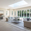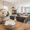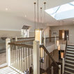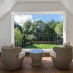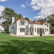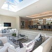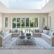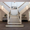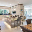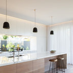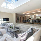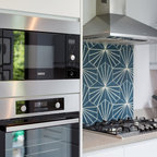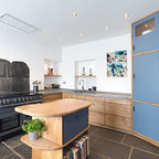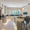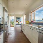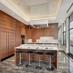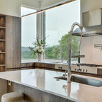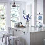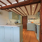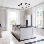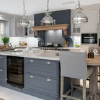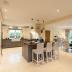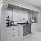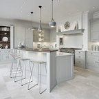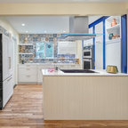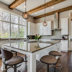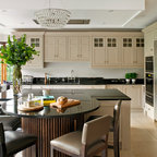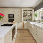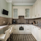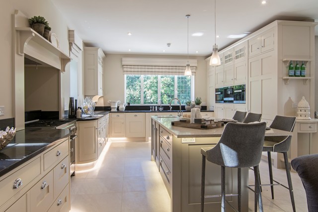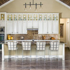 Foto på ett stort vintage u-kök, med skåp i shakerstil, beige skåp, granitbänkskiva, rostfria vitvaror, en köksö och beiget golv — Houzz