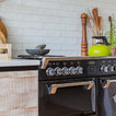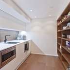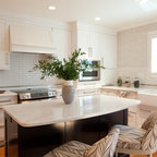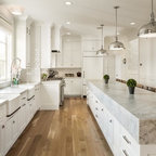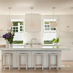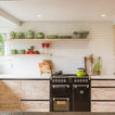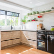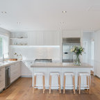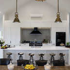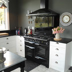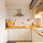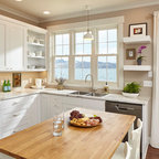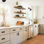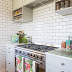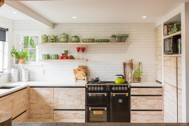 Lantlig inredning av ett l-kök, med en undermonterad diskho, släta luckor, skåp i ljust trä, vitt stänkskydd, stänkskydd i tunnelbanekakel och svarta vitvaror — Houzz