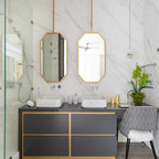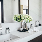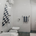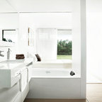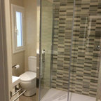 Inredning av ett modernt vit vitt badrum med dusch, med skåp i mellenmörkt trä, en öppen dusch, beige kakel, porslinskakel, beige väggar, klinkergolv i porslin, grått golv, med dusch som är öppen, släta luckor och ett fristående handfat — Houzz