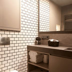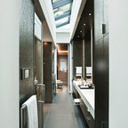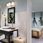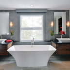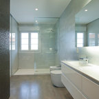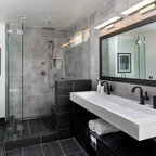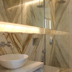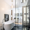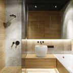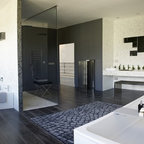 Modern inredning av ett vit vitt en-suite badrum, med släta luckor, vita skåp, ett fristående badkar, en kantlös dusch, beige väggar, marmorgolv, ett fristående handfat och svart golv — Houzz