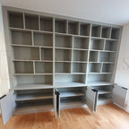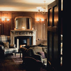 Klassisk inredning av ett allrum med öppen planlösning, med ett musikrum och flerfärgade väggar — Houzz