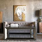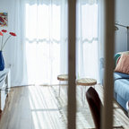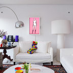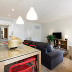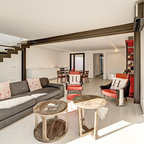 Bild på ett eklektiskt allrum med öppen planlösning, med vita väggar, klinkergolv i keramik, en fristående TV och vitt golv — Houzz