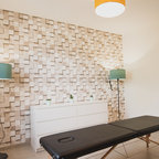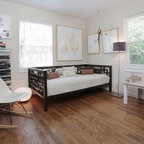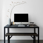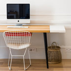 Inredning av ett nordiskt litet hemmabibliotek, med vita väggar, mellanmörkt trägolv och ett fristående skrivbord — Houzz