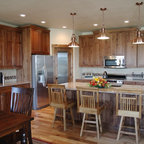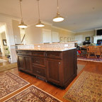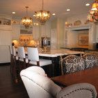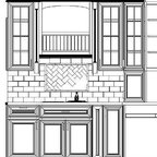 Dark uppers AND lowers Black window grilles, only white on sill around window and trim Hardware style Black faucet White countertops white walls and backsplash with pattern