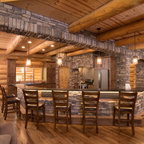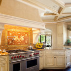 Inredning av ett klassiskt mellanstort vit vitt kök, med en rustik diskho, blå skåp, marmorbänkskiva, vitt stänkskydd, stänkskydd i mosaik, rostfria vitvaror, mellanmörkt trägolv och brunt golv — Houzz