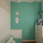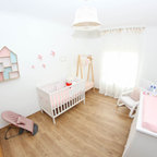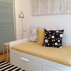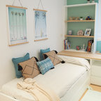 Nordisk inredning av ett mellanstort könsneutralt barnrum kombinerat med sovrum och för 4-10-åringar, med beige väggar och mellanmörkt trägolv — Houzz