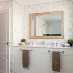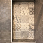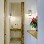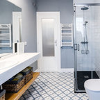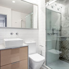 Inredning av ett eklektiskt mellanstort badrum med dusch, med släta luckor, vita skåp, en hörndusch, beige väggar och ett integrerad handfat — Houzz