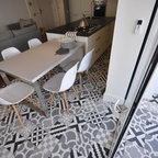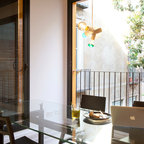 Foto på ett mellanstort funkis kök med matplats, med vita väggar och mellanmörkt trägolv — Houzz