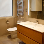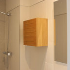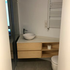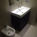 Inspiration för mellanstora moderna badrum, med släta luckor, vita skåp, en vägghängd toalettstol, vita väggar, mellanmörkt trägolv och ett fristående handfat — Houzz