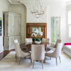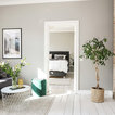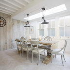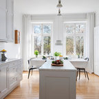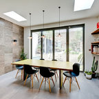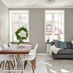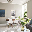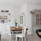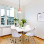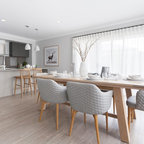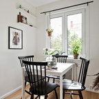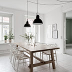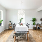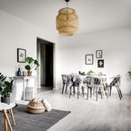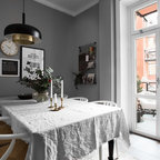 Nordisk inredning av en matplats med öppen planlösning, med grå väggar, ljust trägolv och vitt golv — Houzz