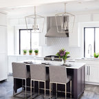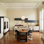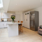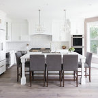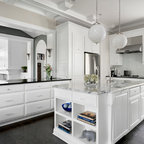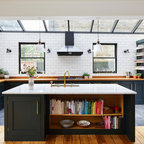 Inspiration för stora klassiska linjära beige kök och matrum, med blå skåp, beige stänkskydd, rostfria vitvaror, en köksö, skåp i shakerstil och beiget golv — Houzz