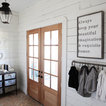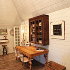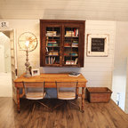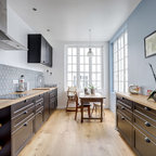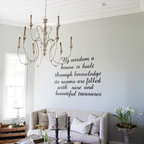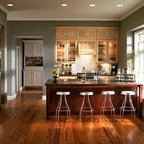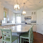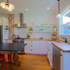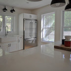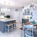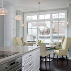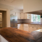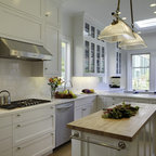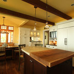 Kitchen style likely a mix of farmhouse and transitional (not traditional) styles - analogous to our living room millwork and entryway wainscoting -- as we understand that style, described as traditional but with some cleaner and simpler lines with a softer feel, wood ttones, etc.