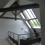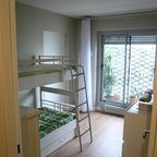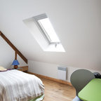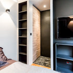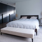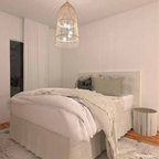 Modern inredning av ett huvudsovrum, med vita väggar och ljust trägolv — Houzz