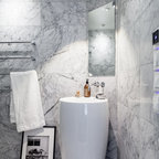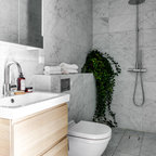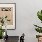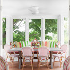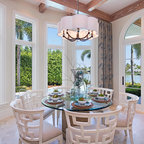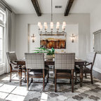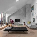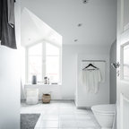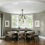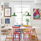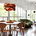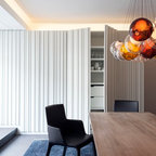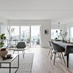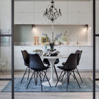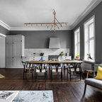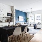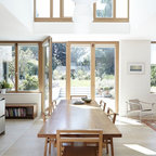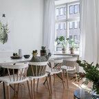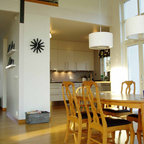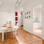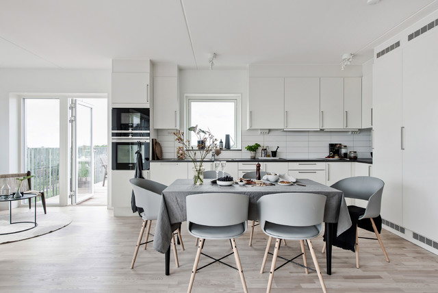 Inspiration för minimalistiska matplatser med öppen planlösning, med vita väggar, ljust trägolv och beiget golv — Houzz