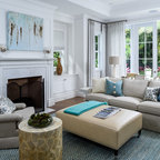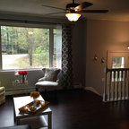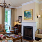 Bild på ett mellanstort vintage allrum med öppen planlösning, med grå väggar, en standard öppen spis, ett finrum, mörkt trägolv och brunt golv — Houzz