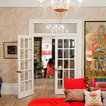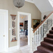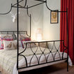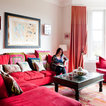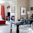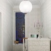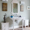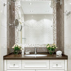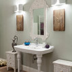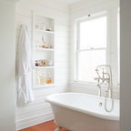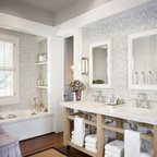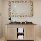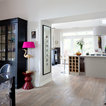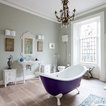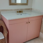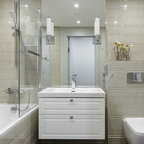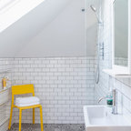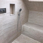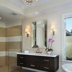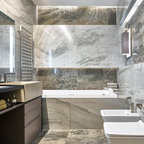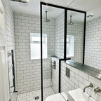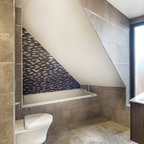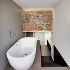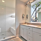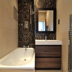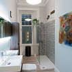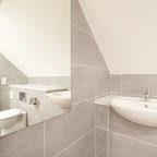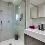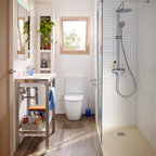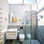 Inspiration för ett litet funkis badrum med dusch, med en toalettstol med separat cisternkåpa, mellanmörkt trägolv, släta luckor, skåp i mörkt trä, en hörndusch, ett integrerad handfat, grå väggar och med dusch som är öppen — Houzz
