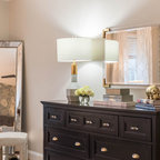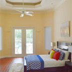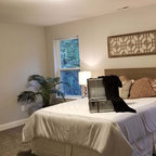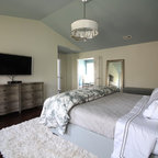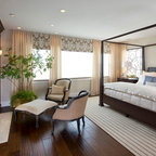 Exempel på ett mellanstort klassiskt huvudsovrum, med blå väggar, mörkt trägolv och brunt golv — Houzz