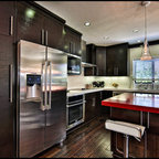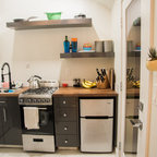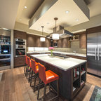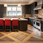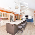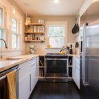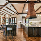 Inspiration för ett stort funkis kök, med en rustik diskho, luckor med infälld panel, rostfria vitvaror, en köksö och granitbänkskiva — Houzz
