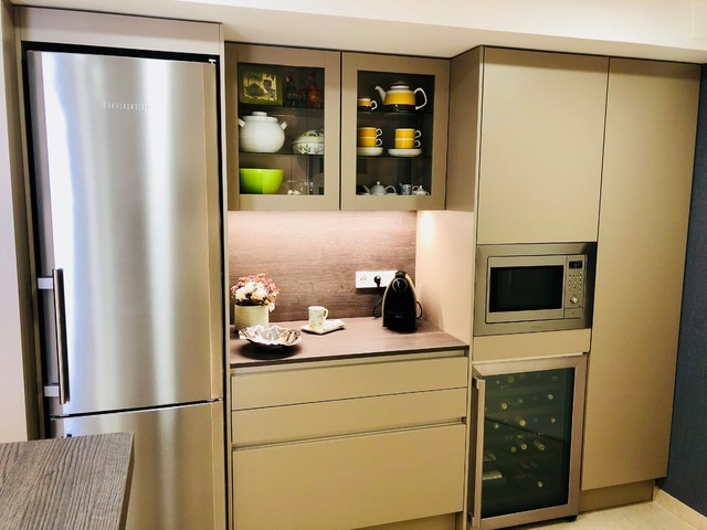 Idéer för att renovera ett avskilt, mellanstort linjärt kök, med en halv köksö — Houzz