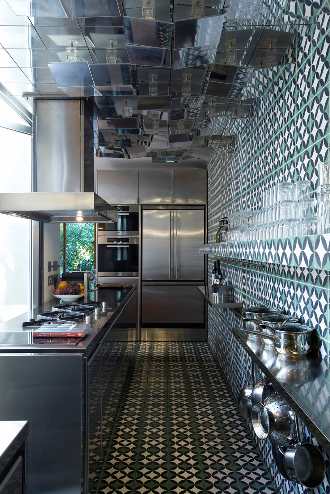 I det här köket har designern valt att lägga fokus på både golv, vägg och tak. Just taket har smyckats med ett lager av vinklade speglar, som reflekterar ljuset på ett vackert sätt samtidigt som det tillför lite humor till utrymmet.