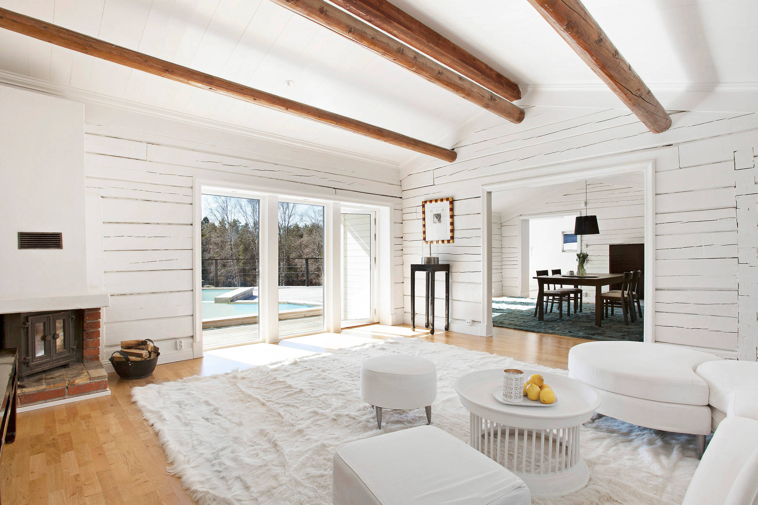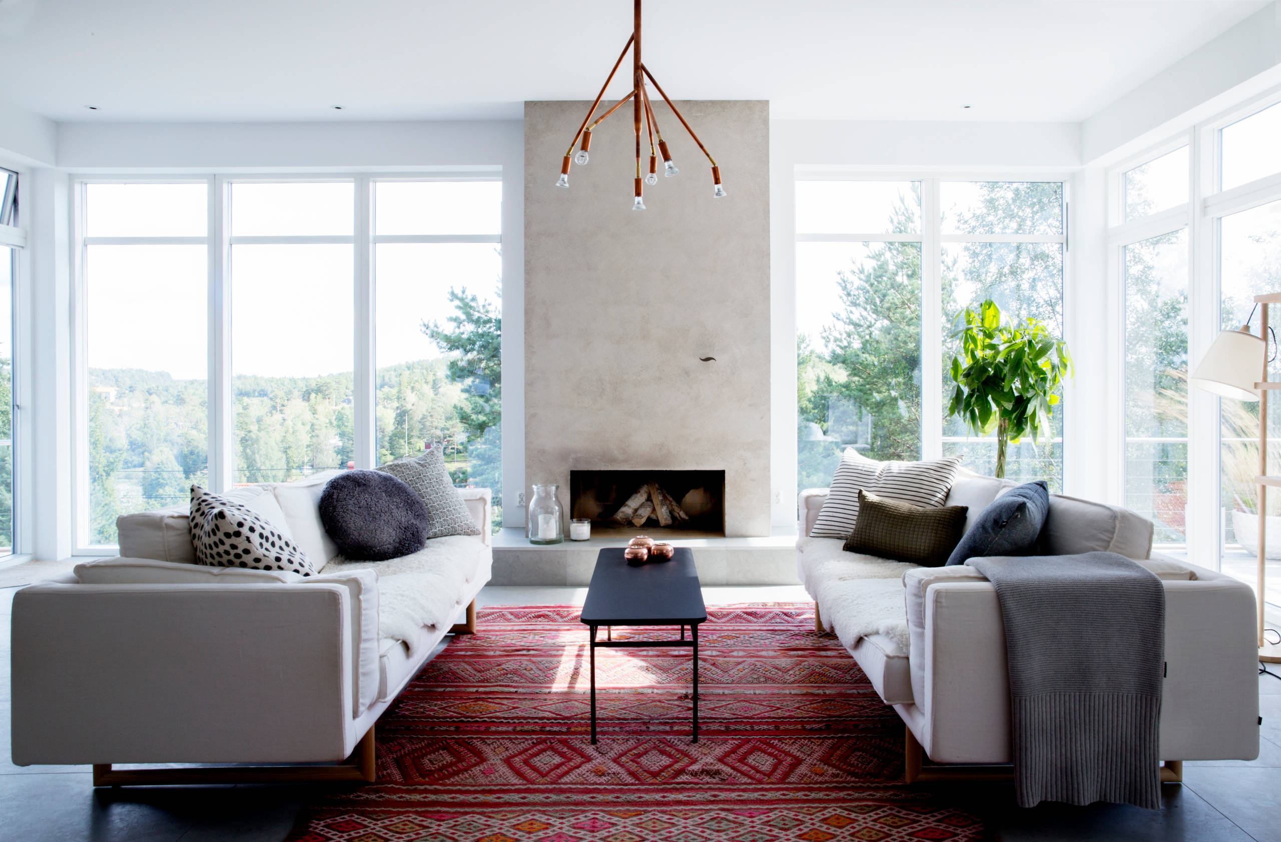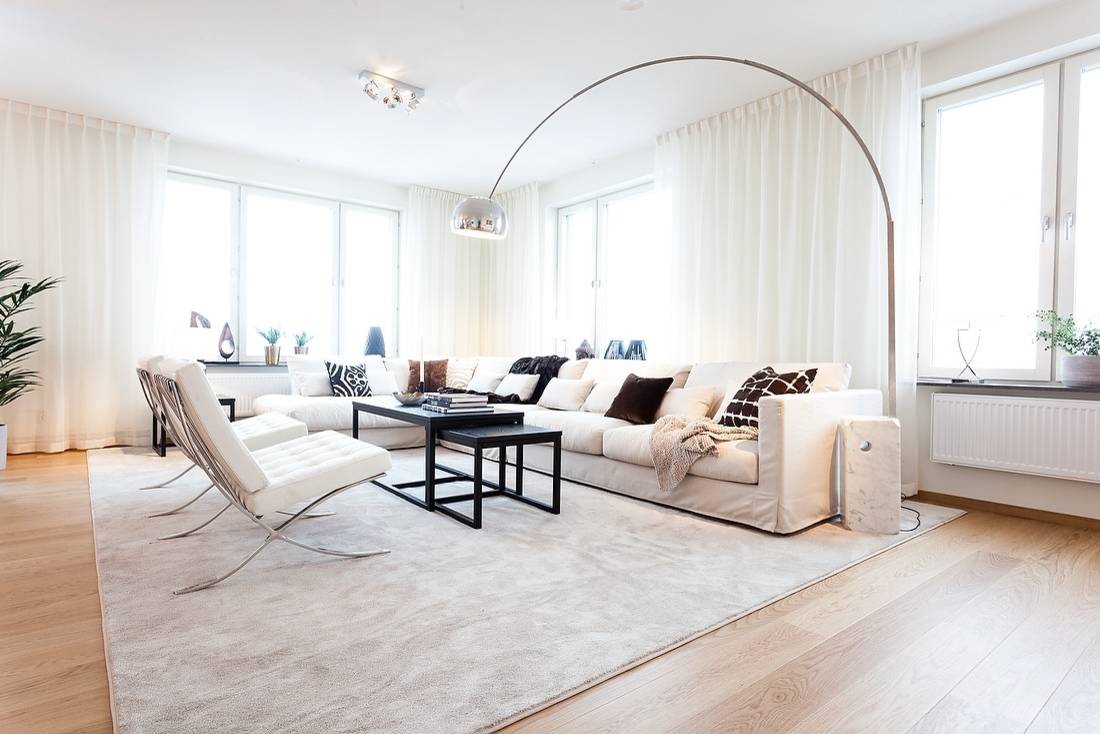En riktigt stor matta som rymmer hela möblemanget kan förstora rummet och ge ett mysigt intryck, utan att du behöver mycket möbler. Se bara på detta rum, där möblerna placerats på kortsidan av mattan, istället för på långsidan vilket är vanligast. Detta gör att rummet förlängs ut mot fönstren.