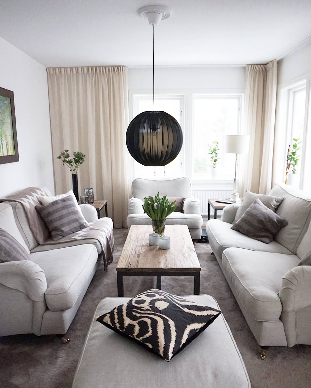 Det kan tyckas motsägelsefullt att skapa rymd genom att minska avståndet mellan möblerna, men det ger faktiskt ett bättre läge för belysning, och utrymme för inredningsdetaljer som växter och golvlampor.