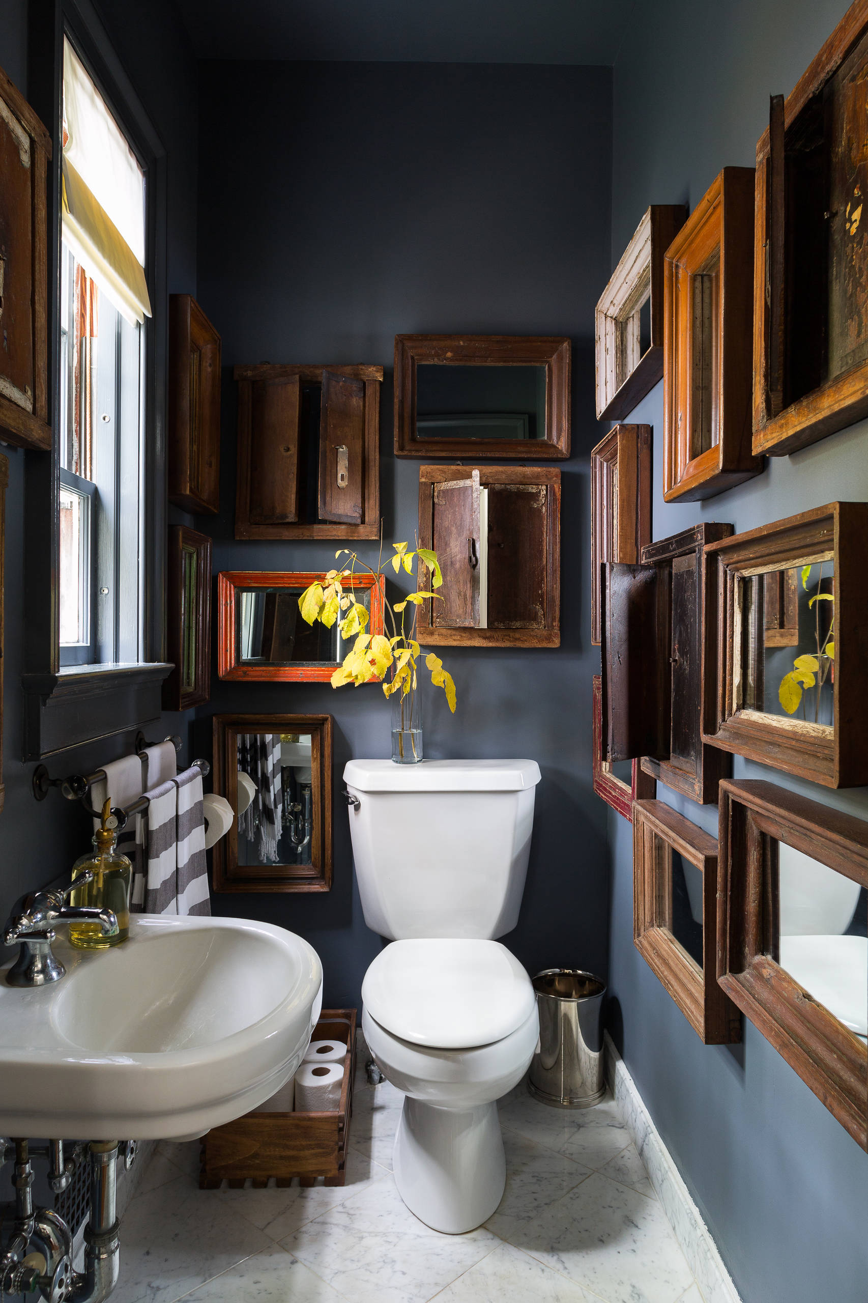 Tänk även på att ta in saker i badrummet som kanske inte traditionellt ‘hör hemma’ där. Detta funkar särskilt bra på gästtoaletter, där det inte blir vått av bad och dusch. Ett knippe tomma ramar förses med spegelglas, en vägg målas spännande grå, och voila! Annorlunda och vackert på liten yta – och budget.