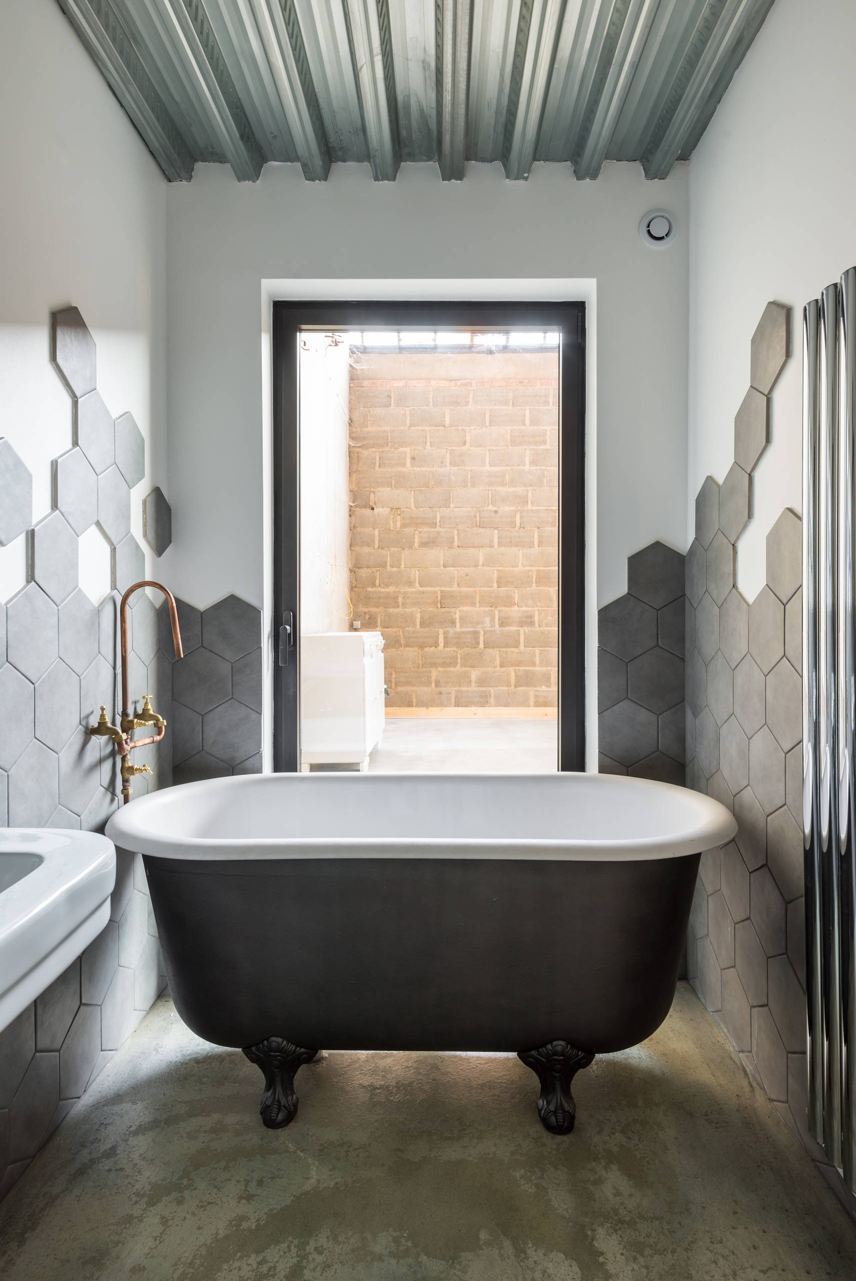 6. Kakel kakel på väggen där. Våga ta ut svängarna och tänk utanför ramarna när du kaklar ditt lilla badrum. Kakel behöver varken vara fyrkantigt eller kaklas på ett fyrkantigt sätt – hexagonkakel kan klättra och ge intresse till vita väggar.