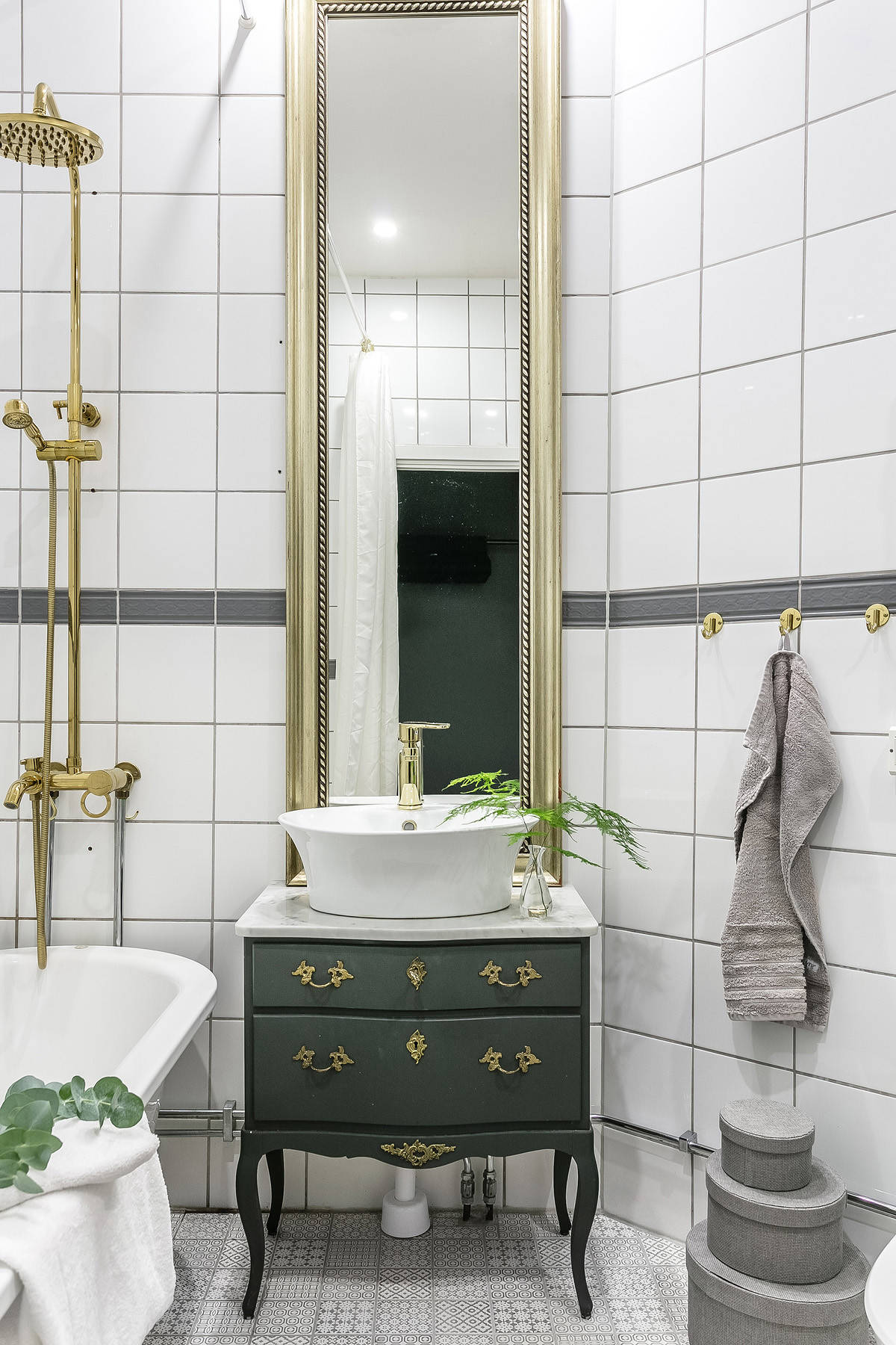Att använda speglar för att förstora ett litet utrymme är ett klassiskt knep. Tänk på att spegeln i sig är ett blickfång – var inte rädd att ta ut svängarna! Maffiga guldramar är alltid tjusigt, även om man har ett mindre badrum än det på bilden.