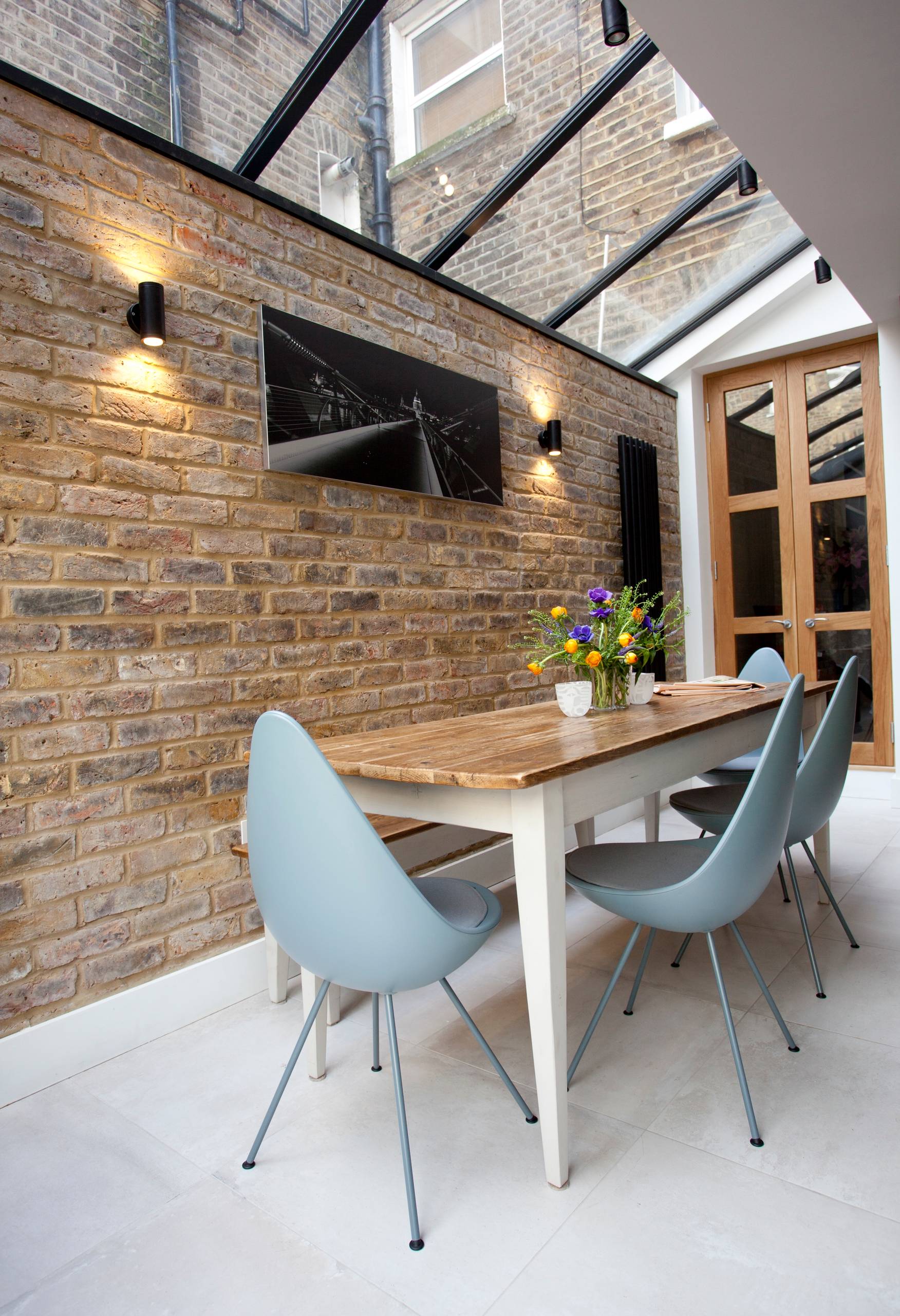Tegel fungerar väldigt bra som bärande element i väggar, det har bra fuktegenskaper och håller länge. Nackdelen är att det nästan bara fungerar i tryck, alltså är det svårt att göra stora öppningar i tegel. Det är därför man ser så många valv i gotiska kyrkor, det är enda sättet att skapa öppningar. Det passar därför bra att använda tegel i murar och liknande situationer och sen komplettera det med andra material där man eftersträvar öppenhet. Här möter gammal byggteknik en lättare glaskonstruktion.